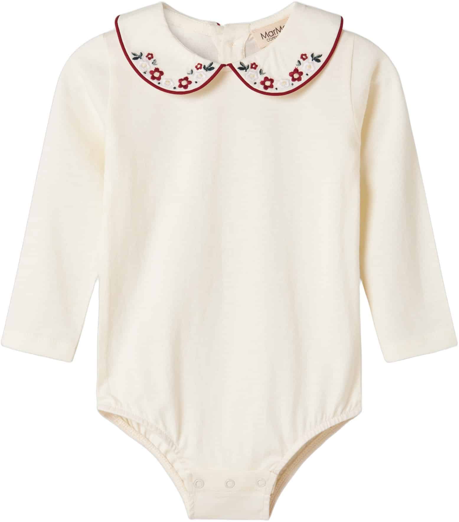 Langærmet bodystocking med rund krave og fine blomster broderede detaljer. Bodystockingen lukkes med knaplukning bagpå samt lukkes med trykknapper mellem benene for nem bleskiftning. Bodystockingen er både blød, strækbar og behagelig at have på. Jersey Bl