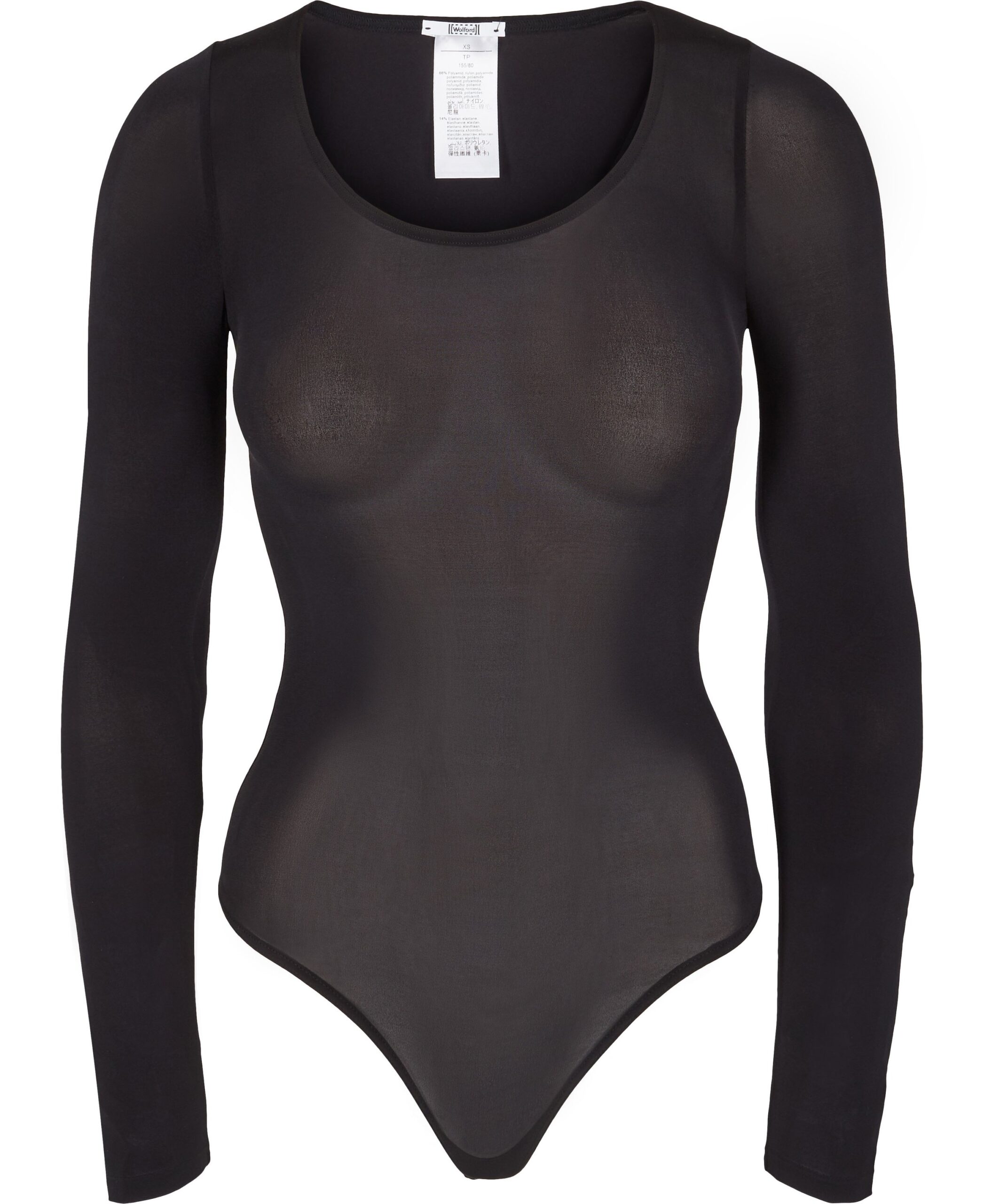 Body fra Wolford i en silkeblød kvalitet med en god elasticitet og et let transparent udtryk. Bodyen har lange ærmer, en rund halsudskæring samt en G-strengskile med trykknapslukning. En ultrafeminin body, som er ideel i basisgarderoben.