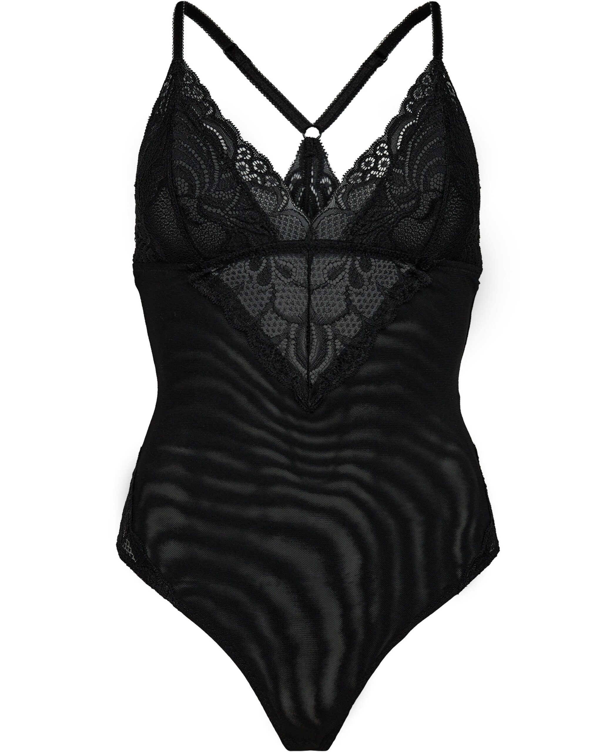 Bodystocking fra Magasin du Nord Collection i en smuk mesh- og blondekvalitet. Bodystockingen er enkel i modellen med trekantede skåle, smalle, justerbare skulderstropper, der samles på ryggen samt trykknapper i kilen. En skøn bodystocking i den lækreste