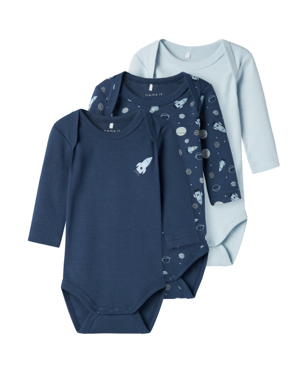 Name It 3-pak bodystocking i sødt rum tema til baby er lavet af blødt, åndbart materiale, der giver komfort hele dagen. Perfekt til hverdagens behov med trykknapper, der gør dem lette at skifte og style.