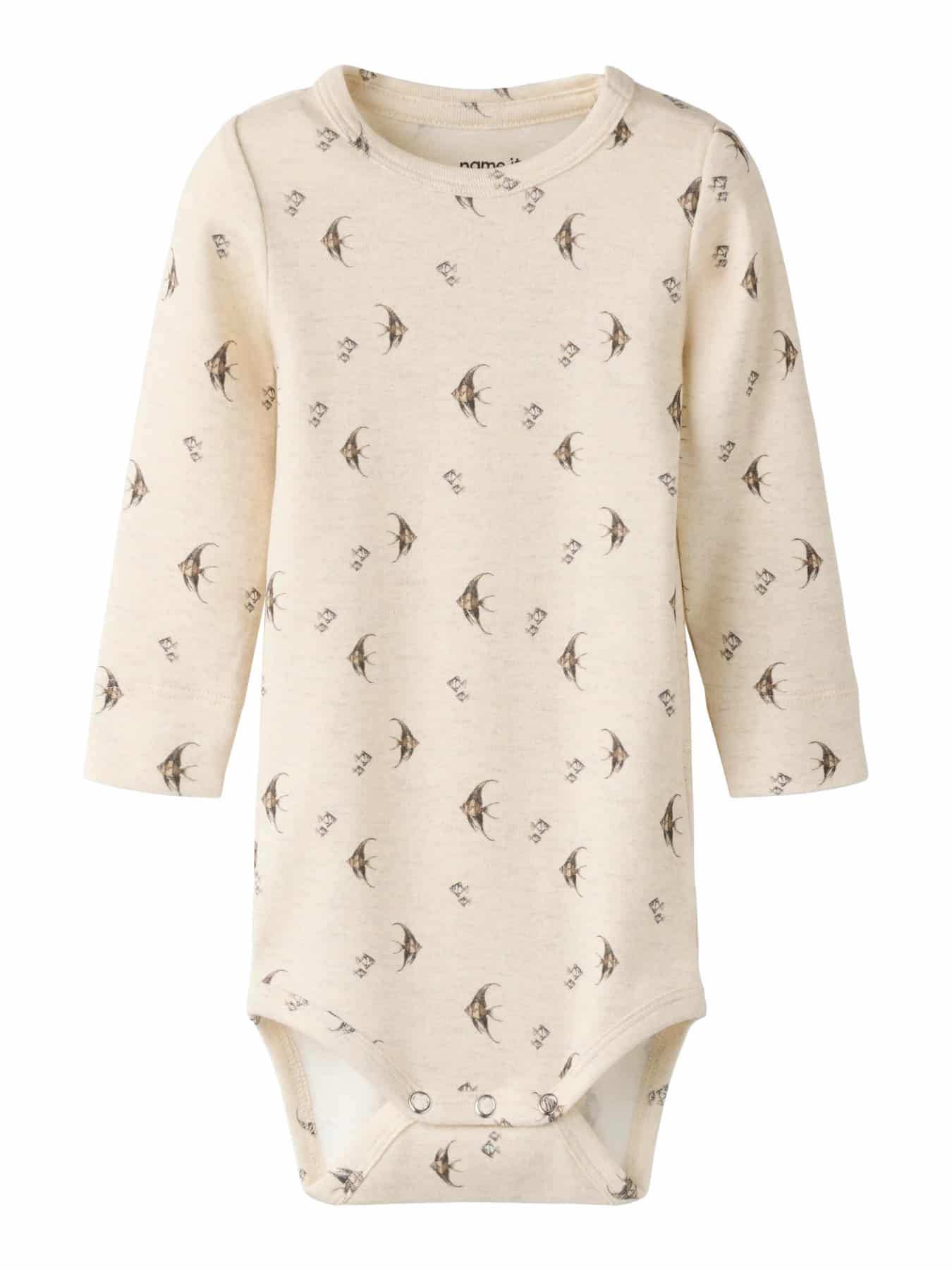 Blød og praktisk bodystocking med lange ærmer og rund hals, ideel til brug året rundt. Den er lavet i ribstrik, som sikrer en komfortabel og fleksibel pasform. Trykknapper ved skulder gør den nem at få af og på, mens det gennemgående print giver et modern