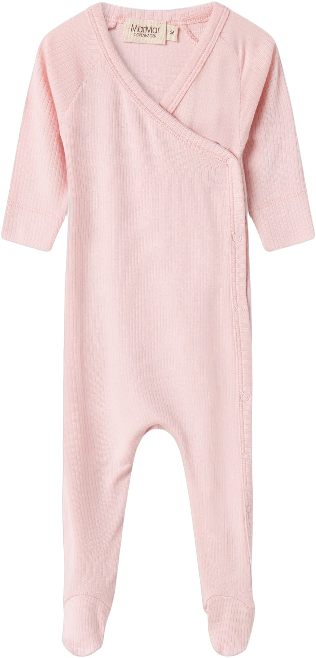 Langærmet baby modal bodystocking med stolpe knaplukning, der bliver lukket med trykknapper mellem benene for nem bleskiftning. Bodystockingen er både ribstrikket, blød, holder form og farve og har elastan i sig som gør den strækbar og behagelig at have p