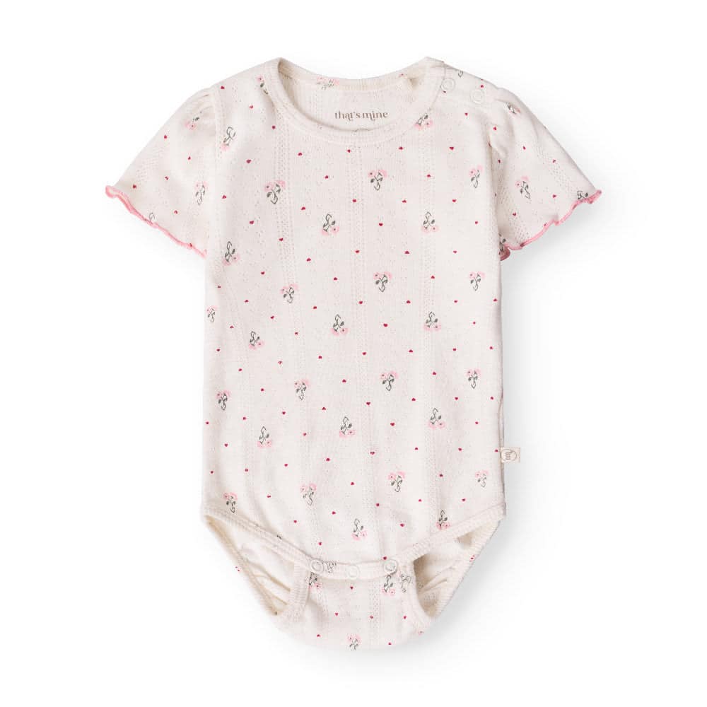 Blød pointelle-body med det søde all-over print Blooming Love. Fremstillet i økologisk bomuld. Alle babyer vokser i deres eget tempo og på deres helt egen unikke måde. Vores bodystocking er designet til at hylde denne individualitet. Med en smart dobbeltl