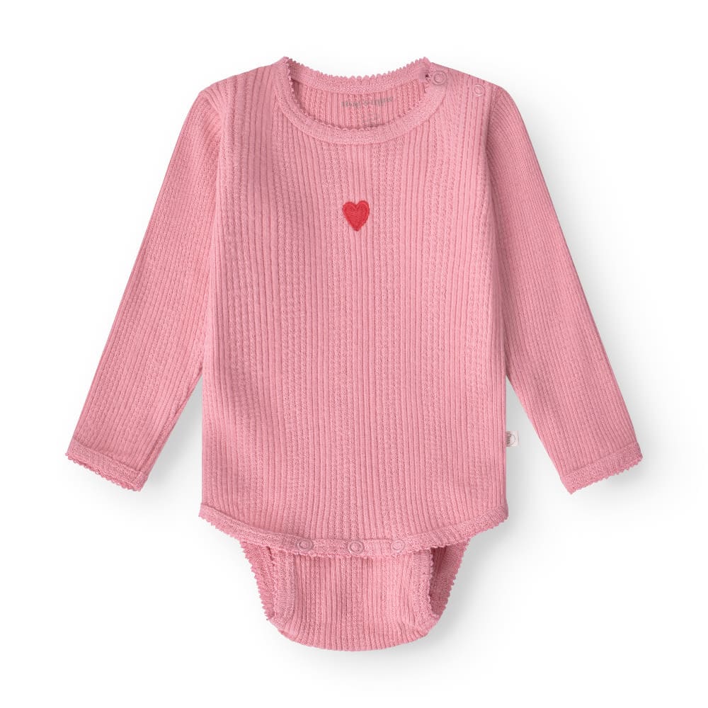 Blød børstet pointelle bodystocking med borderet lille rødt hjerte. Ekstra knapper i bunden, så man lige kan bruge den lidt længere tid. Lavet i blød økologisk bomuld. Let fnuller kan forekomme over tid som en naturlig følge af brug.