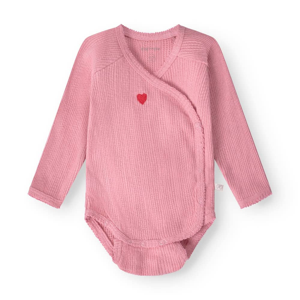 Blød børstet pointelle slå-om bodystocking med borderet lille rødt hjerte. Ekstra knapper i bunden, så man lige kan bruge den lidt længere tid. Lavet i blød økologisk bomuld. Let fnuller kan forekomme over tid som en naturlig følge af brug.