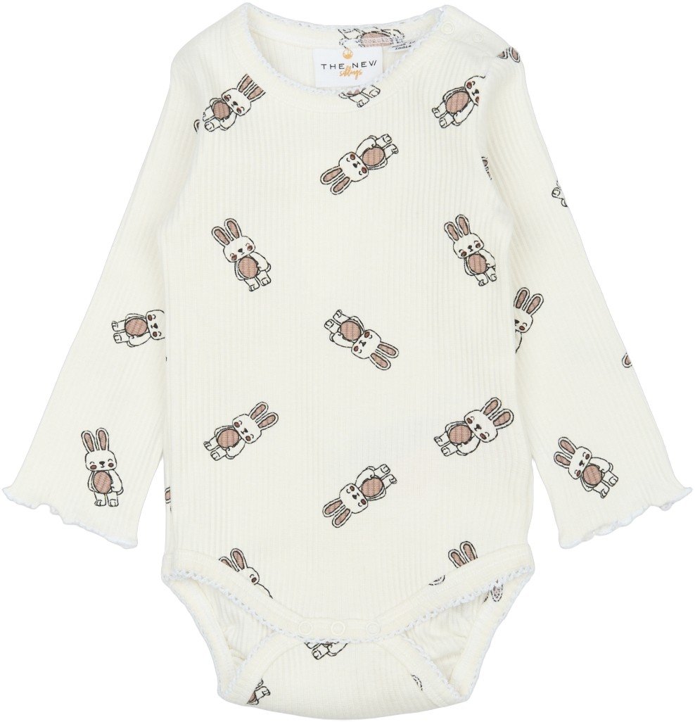 Langærmet ribstrikket bodystocking med et sødt mønster af smilende kaniner. Denne charmerende bodystocking fra THE NEW Siblings er perfekt til sæsonen og egner sig både til hverdag og særlige anledninger. Den har søde blonde-detaljer rundt ved åbningerne